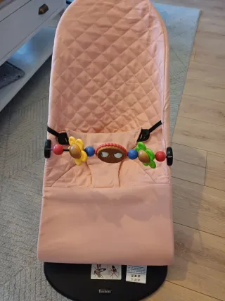 Hamaca Babybjörn en color rosa, ideal para bebés. Incluye dos fundas y un juguete. - Hamaca de color rosa. - Incluye dos fundas,la original es gris y negra y otra de imitacion en rosa. - Juguete para la hamaca original.