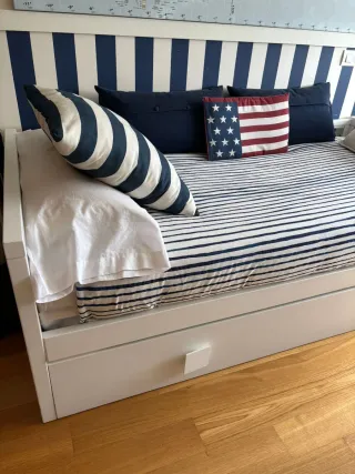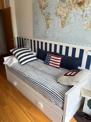 Cama nido blanca, ideal para habitaciones infantiles o juveniles. Cuenta con otra cama en la parte inferior. Las dos camas son de 90 x 190 cms. Incluye somieres y colchones. También entregamos funda nórdica y cojines, como se muestra en las fotos. - Estructura de madera lacada en blanco. - Diseño moderno y funcional. - Incluye somier. - Fácil de limpiar.