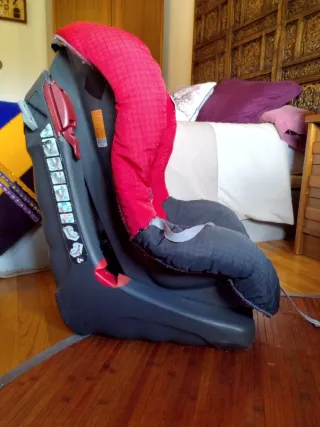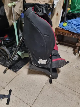 Silla de coche para niños, con un diseño ergonómico y acolchado. - Funda de tela roja y negra. - Base de plástico negro.