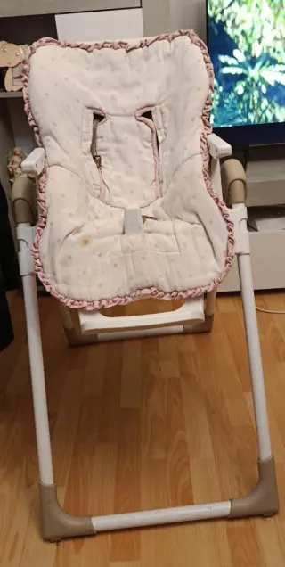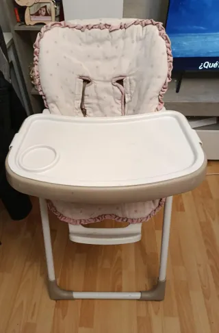 Trona para bebé con un diseño acolchado y funda en color rosa. - Funda acolchada con volantes. - Bandeja extraíble. Viene doble. - Plegable para fácil almacenamiento.