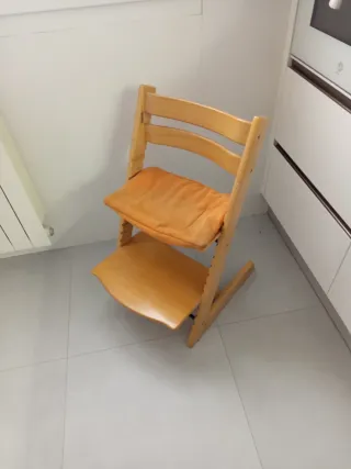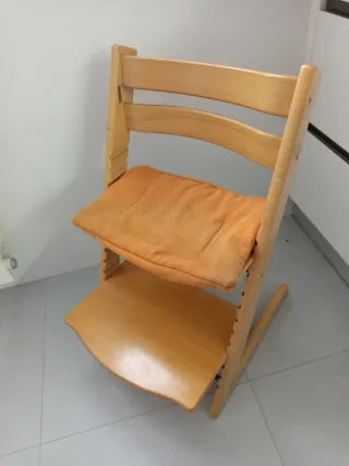 Silla evolutiva de madera de la marca Stokke, ideal para acompañar el crecimiento. - Diseño ergonómico. - Asiento y reposapiés ajustables. - Material de madera natural. -Con fijación para niños muy pequeños -Regalo funda original para el asiento