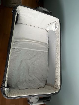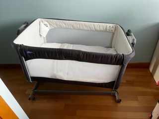 Cuna de colecho Chicco Next2Me Magic en color Moon Grey. Diseñada para facilitar el descanso compartido. - Mecanismo de apertura de barandilla con una sola mano. - Laterales de malla para ventilación. - Altura regulable. - Ruedas para fácil movilidad. Incluye juegos de sábanas original de la cuna (bajera, edredón y funda de edredón)