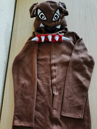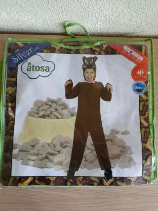 Disfraz de 2 piezas (mono y capucha), talla 5-6 años, color marrón, cierre delantero con velcro, incluye funda, ideal para fiestas o carnaval. Marca: Atosa.