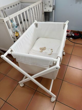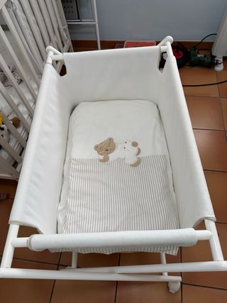Se venden dos minicunas blancas para bebé, ideales para los primeros meses. Una con fundas en tonos camel y la otra con fundas en tonos azul bebé. - Color blanco. - Diseño moderno y funcional.