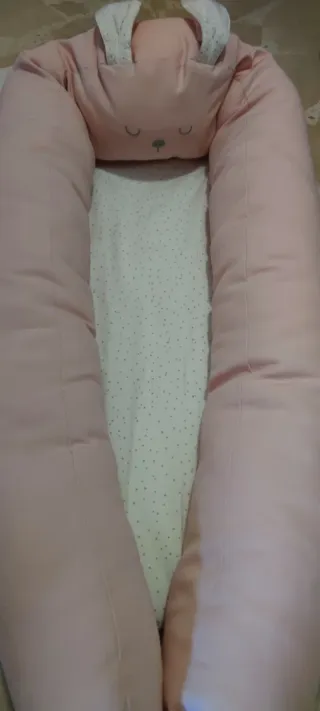 Nido para bebé en color rosa, con un adorable diseño de conejo en la cabecera. - Suave tejido. - Orejas decorativas de conejo. - Incluye funda interior con estampado de topitos.