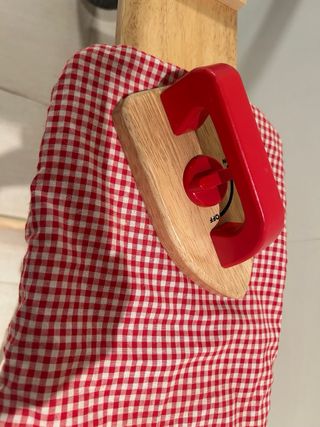 Tabla de planchar de madera para jugar, con su propia plancha. - Estructura de madera. - Funda de tela a cuadros rojos y blancos. - Incluye plancha de juguete roja y madera.