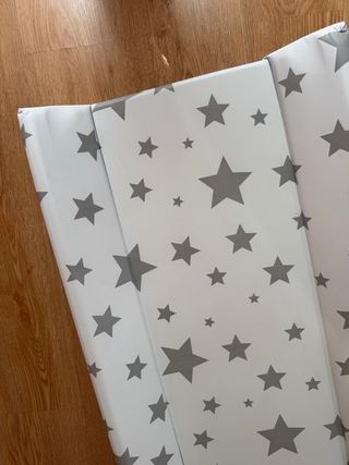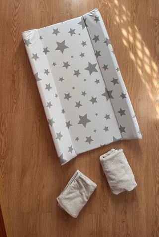 Cambiador rígido (relleno de espuma) con estampado de estrellas grises sobre fondo blanco. Plastimyr. Medidas: 50cm ancho x 10cm alto x 80cm largo. Queda perfecto en la cómoda MALM de Ikea. Incluye dos fundas de rizo en tono gris (80% algodón, 20 % poliéster), modelo SKÖTSAM Ikea. COMO NUEVO.