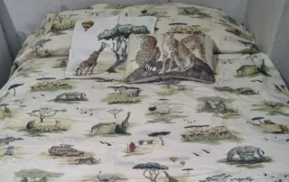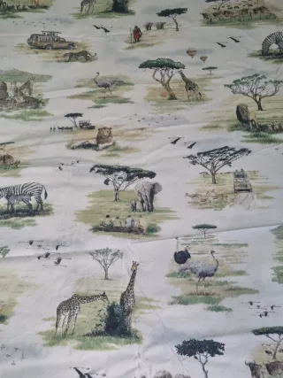 Funda nórdica con un divertido estampado de animales de la sabana africana, ideal para habitaciones infantiles. El diseño incluye jirafas, leones, cebras, elefantes, hot air balloons y un jeep. - Estampado de safari. - Diseñada para camas infantiles. -Funda para cama de 90cm en perfecto estado. (Ver medidas en las fotos). - 2 Fundas de cojines a juego sin relleno nuevos. (Ver medidas en fotos) Todo en perfecto estado.