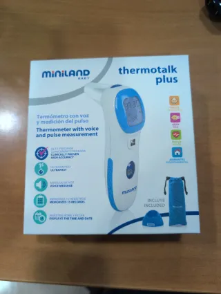 Termómetro digital Miniland Thermotalk Plus. - Termómetro con voz y medición del pulso. - Alta precisión clínicamente probada. - Ultrarrápido, solo 1 segundo. - Mensaje de voz. - Memoriza 15 registros. - Muestra hora y fecha. - Incluye funda y soporte.