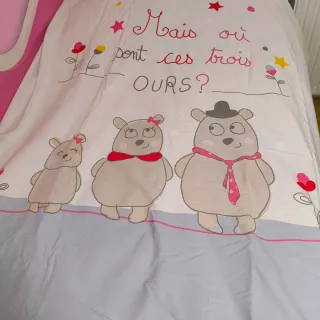 Funda nórdica infantil reversible para cama individual. Presenta un divertido diseño de ositos y por el otro lado fondo rosa y lunares de colores. Incluye también funda cojín con dos estampados. - Medidas: Funda Nórdica 135 x 190 cm y funda cojín 62.5 x 60 cm - Marca: Vertbaudet. - Material: 100% Algodón. La funda nórdica tiene en la parte de abajo un rectangulo más de tela para que se sujete bien debajo de la cama y no se salga el nórdico.