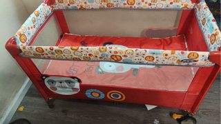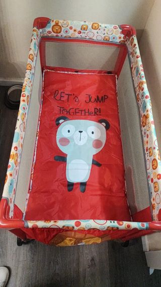 Se vende parque cuna rojo sin apenas uso. Marca jane. Con funda de viaje