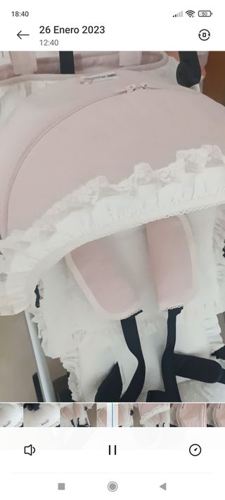 preciosa vestidura para Bugaboo ant,en punto rosa combinado con plumeti beige y volante de puntillas. compuesto por bolso ,funda y capota extensible de la marca Baby Luna