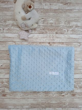 Manta arrullo para bebés, marca Naf Naf. Color azul celeste. Medidas 80x110 cm. Tacto muy suave y agradable. Por una cara tiene diseño de lunares en relieve, por la otra cara es lisa. Tejido 100% poliéster. Se puede usar como arrullo o como manta para cuna, capazo, etc. Muy calentita! Está prácticamente nueva, muy poco uso. Se envía con funda.