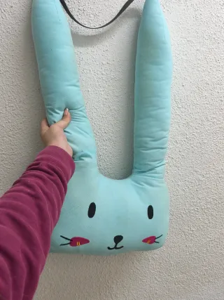 Este adorable cojín con forma de conejo es perfecto para la comodidad del niño en el coche. - Color azul. - Diseño de peluche suave. - Orejas largas. - Rostro bordado con ojos, nariz y boca. - Mejillas con detalles rosas y líneas negras. Tiene unas marcas la funda Escucho ofertas