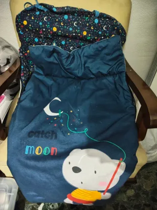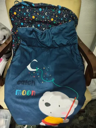 Funda para silla de paseo con un diseño tierno de osito y la frase catch the moon. - Estampado de lunas y estrellas. - Color azul marino. - Acolchada para mayor comodidad.