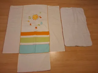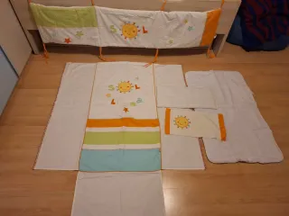 Conjunto de chichonera y colcha para cuna con un diseño alegre de sol y luna. - Chichonera acolchada con apliques de sol, estrellas y luna. - Colcha con diseño a juego, con franjas de colores y motivos infantiles. Incluye relleno para el invierno. -Almohada y su funda. - Tejido suave y transpirable.