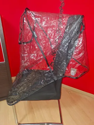 Funda de plástico transparente para proteger la silla de paseo de la lluvia. - Material: Plástico. - Color: Transparente con detalles en negro.