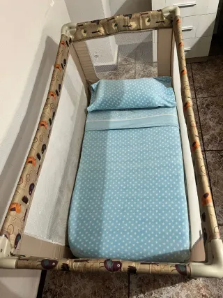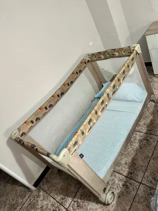 Cuna-parque plegable, tiene funda de transporte con asas y dos alturas.