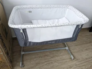 Mini cuna marca Jane con la función colecho para adaptarlo a todo tipos de camas, también se puede poner independiente y tiene varias posiciones de elevación, tiene una ventana frontal que te permite vigilar al bebé sin necesidad de levantarte, incluye el colchón y la funda nórdica, estado muy bueno , recoger en Motril