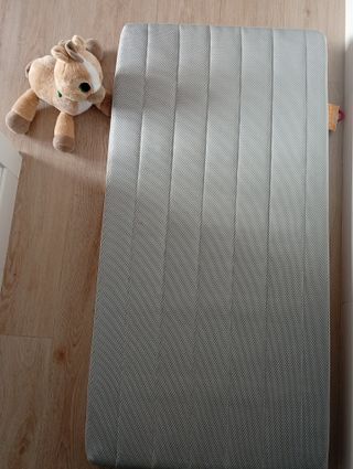 Colchón para cuna de tamaño 60x120 cm, modelo Ecus Kids. Nuevo, no se ha usado. Precio tienda natura descanso 170 euros. Tiene un peso de 3,9 kg y una altura de 12 cm. La funda del colchón es extraíble y lavable, lo que facilita su mantenimiento e higiene. El colchón cuenta con una capa doble de tejido 3D que permite una mejor ventilación, lo que ayuda a regular la temperatura y la humedad - Tejido acolchado. - Transpirable.