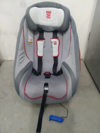 Silla de coche para bebé de la marca Prenatal en color gris con detalles en rojo. Cuenta con arnés de seguridad de 5 puntos y protectores acolchados. - Diseño ergonómico. - Funda extraíble para lavado. Anclaje mediante cinturón de seguridad del coche.