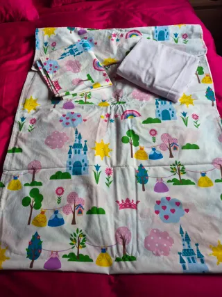 Funda nórdica infantil con un alegre diseño relacionado con las princesas disney. - Compuesta por funda nordica, sabana bajera y almohada. - Medidas en la etiqueta. - Estampado de castillos, coronas y vestidos. - Colores vivos y alegres. - Ideal para habitaciones infantiles.