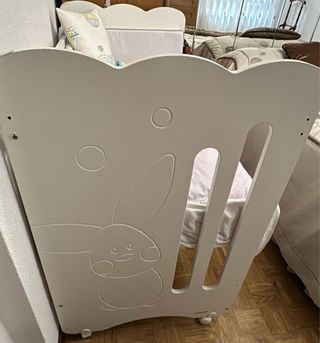 Cuna de bebé en color blanco con un tierno diseño de conejo grabado en uno de sus laterales. Ideal para el descanso del bebé. - Diseño con figura de conejo. - Estructura de madera. - Ruedas para facilitar el movimiento. Tiene todas las barreras, aunque en la foto hay una desmontada. Incluye colchon Esta bien, marcada por el uso. Pero no hay nada roto, y el colchon como nuevo porque siempre lo usamos con fundas