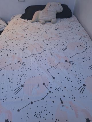 Funda nórdica con un bonito diseño de estrellas, constelaciones y unicornios en tonos pastel. Ideal para una habitación infantil. Con almohada en forma de unicornio. Marca polar Medida 1.55 x 2.65 (ideal para cama 105, puede valer para cama 90)