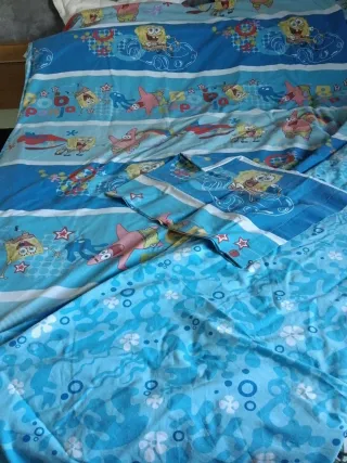 Conjunto de funda nórdica y sábanas con estampado de Bob Esponja. - Diseño colorido con personajes de la serie. - Medidas de la funda nórdica: 143x258 cm.