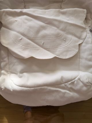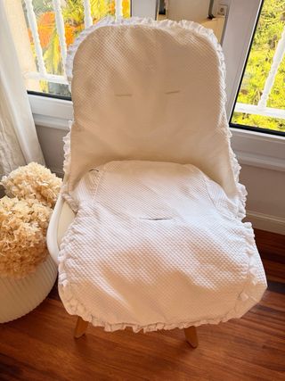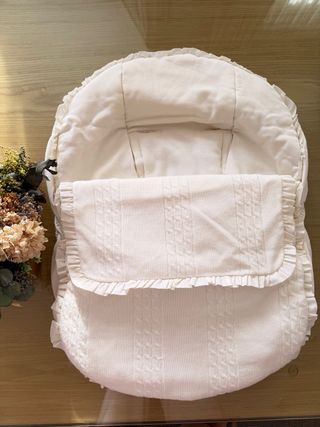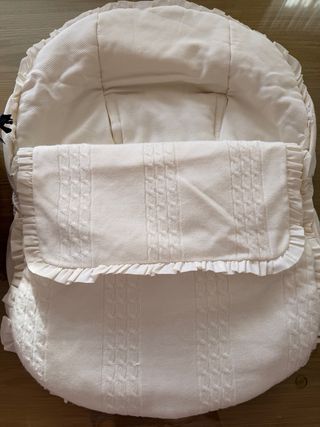 Funda y saco para silla de bebé de color crudo. Un conjunto ideal para el confort del pequeño. Muy cuidado y en muy buen estado. - Diseño acolchado, de punto y algodón - Acabado con volantes. - Tejido con textura de trenzas. Hago envios