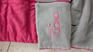 Funda para silleta de bebé en color gris con detalles en rosa. - Tejido suave y acolchado. - Bordado con el nombre akon by Bebelé en hilo rosa. - Ribete exterior en color rosa.