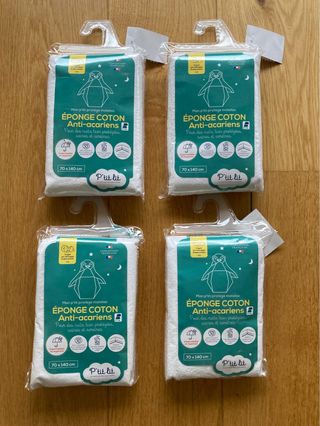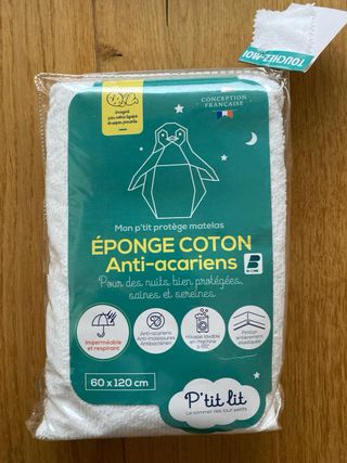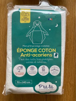 Protector de colchón de felpa de algodón impermeable y antiácaros P'TIT LIT nuevo sin estrenar, con etiqueta y sin abrir. Una funda de felpa de rizo 100% algodón, ultrasuave y absorbente. Su película impermeable de poliuretano, suave, microrrespirante y silenciosa ofrece noches serenas y una protección del colchón total. Gracias al tratamiento protector Bi-Ome®, el bebé estará protegido contra ácaros, bacterias y hongos para disfrutar de una higiene perfecta. Forma de sábana bajera, para una adecuada sujeción en el colchón. Fácil colocación, gracias a sus acabados elásticos.
