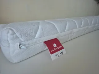 Cojín antivuelco desenfundable marca Alondra, ideal para cambios de posicionamiento del bebé. Es de forma rectangular y tiene funda extraíble de color blanco ideal para lavar en la lavadora y relleno de foam. Está nuevo sin usar, mide 114 cm x 11 x 11 cm.