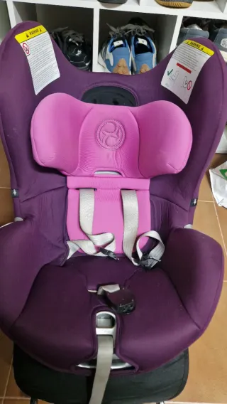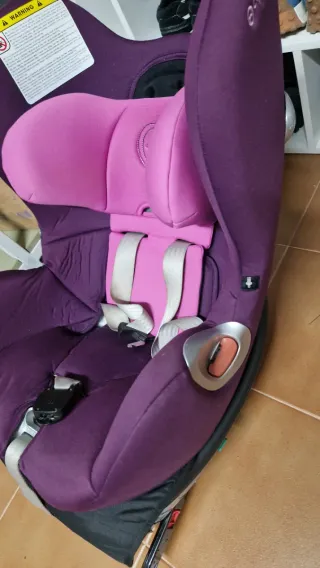 Silla de coche Cybex en color morado y detalles en rosa. - Diseño acolchado para mayor comodidad. - Sistema de arnés de seguridad. - Funda extraíble. - silla para usar desde el principio a contramarcha y luego hacia delante. Muy comoda al girar sobre la base negra para amarrar al bebe