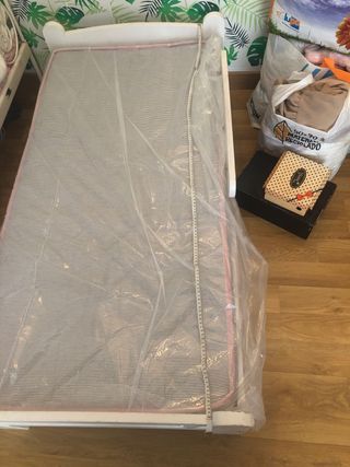 Barreras de cama para niños, se han usado para cama de 90, medidas 1'50 de largo x 0'57 de alto. Queda el hueco justo para que puedan bajarse de forma segura. Es abatible para poder hacer la cama y acostar añ peque de forma cómoda. Se entrega desmontada en su funda(no caja)