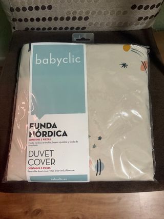 Funda nórdica reversible para cuna de la marca Babyclic. Incluye bajera ajustable y funda de almohada. - Contiene 3 piezas. - Diseño con estrellas y elementos geométricos.
