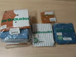 Conjunto de ropa de cama infantil de la marca Vertbaudet nuevo. - Funda nórdica con estampado de zorros en azul. - Sabana bajera con estampado de rayas blanco y azul. - Protectores de cuna chichoneras con diseños. - Funda de almohada con diseño de zorro. - Certificación OEKO-TEX® STANDARD 100.