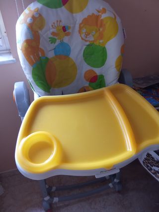 Trona de la marca Prenatal con un divertido diseño de animales en la funda. - Funda acolchada con estampado de animales. - Bandeja amarilla con soporte para vaso. - Estructura gris. - Plegable para fácil almacenamiento.