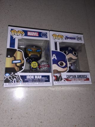 Se venden dos figuras Funko Pop!: Iron Man (edición especial, brillo en la oscuridad) y Capitán América. Están en perfecto estado y vienen en sus cajas originales. - Incluye dos figuras Funko Pop! - Iron Man: Modelo 555, edición especial - Capitán América: Modelo 450
