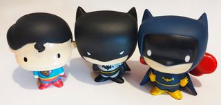 Set de figuras de superhéroes de la Liga de la Justicia de Molto. - Figuras de estilo chibi o funko pop. - Incluye Superman, Batman y Batgirl. - Diseños coloridos y detallados. -Pueden utilizarse como pistolas de agua.