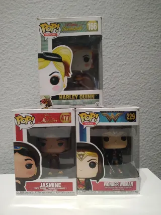 Lote de 3 figuras Funko Pop! de personajes icónicos. - Funko Pop! DC Comics Bombshells Harley Quinn (166) - Funko Pop! Disney Aladdin Jasmine (477) - Funko Pop! DC Comics Wonder Woman (229)