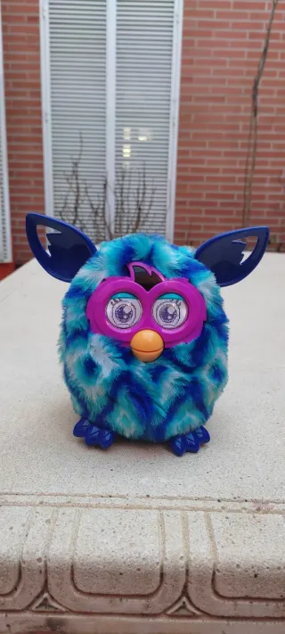 Este es un Furby interactivo con un diseño de pelaje en tonos azules y turquesas. - Orejas grandes y expresivas. - Ojos redondos y brillantes. - Pico naranja. - Patas pequeñas.