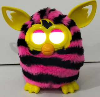 Furby Boom de color rosa intenso fabricado por Hasbro. Funciona perfectamente. Es un juguete animatrónico de peluche que se mueve, habla y responde a la voz. Desarrolla una personalidad única basada en cómo interactúas y juegas con él. Posee ojos LED y puede comunicarse con otros Furbies. Habla su propio idioma, el "Furbish", además de inglés. Funciona con cuatro pilas doble A.