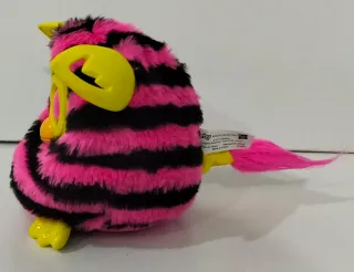 Peluche interactivo Furby Boom con un diseño de rayas llamativo. - Color: Rayas rosa y negro. - Orejas y pies amarillos. - Ojos y pico naranjas.
