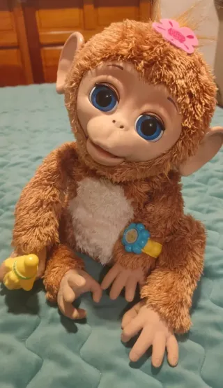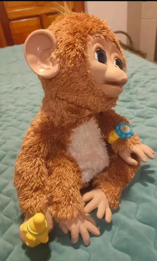 Peluche interactivo Monymonita, un amigo juguetón. Muñeca interactiva Furby original " Monymonita" funciona perfectamente y tiene un pequeño roto en el morro, arreglado como se puede ver en la foto, de ahí su precio; y si se le pintan unos labios rojos quedaría fenomenal. Se hace entrega en mano en Oviedo, Gijón, Mieres y Lena o envío. - Peluche de mono. - Incluye accesorio amarillo en la mano. - Lleva un accesorio de reloj azul en la muñeca. - Adorno de flor rosa en la cabeza.