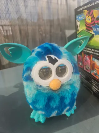 Furby interactivo de color azul con detalles amarillos y cresta turquesa. Incluye su caja original y un manual de instrucciones. - Peluche interactivo. - Diseño con ojos grandes y orejas. - Caja con diseño de Furby. - Manual con consejos prácticos.