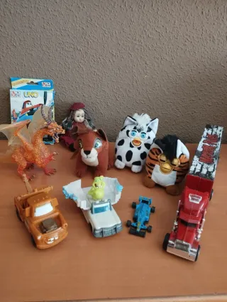 Lote variado de juguetes que incluye varios personajes. Envio por InPost (preferiblemente), Correos o entrega en mano en Madrid. - Camión de juguete rojo. - Muñeca clásica. - Dos Furby. - Coche de juguete marron de película Cars. - Coche de carreras azul. - Coche blanco con figura verde. - Caja de cartas UNO Planes (Saga Cars)