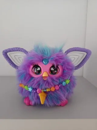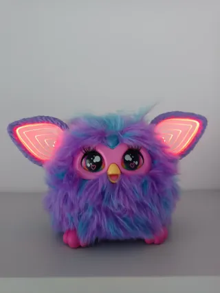 Este adorable Furby tiene un pelaje suave y colorido en tonos morados y azules, con detalles brillantes en las orejas. - Pelaje multicolor (morado y azul). - Orejas con detalles plateados.