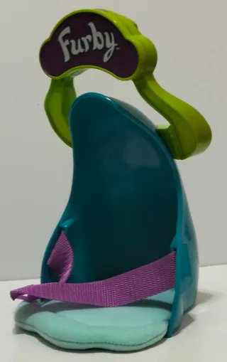 Este Furby viene con su capazo y accesorios. - Furby de peluche rojo y blanco. - Incluye gorro de Papá Noel. - Capazo de plástico azul con cinturón morado. - Accesorio de plástico verde con forma de corazón y texto Furby. - En funcionamiento.