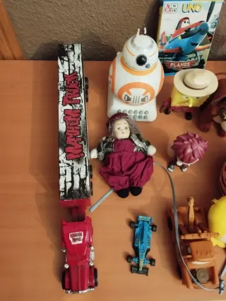 Lote variado de juguetes, cartas y peluches. Envio pero priorizo entrega en mano en Madrid. - Incluye hucha de Star Wars, figuras Cars,figuras de naruto, harley quinn de dc, supergirl, bob esponha, cazafabtasmas,y más. Coches y camion. - Peluches de rey leon y Furbies. - Cartas UNO de Planes.